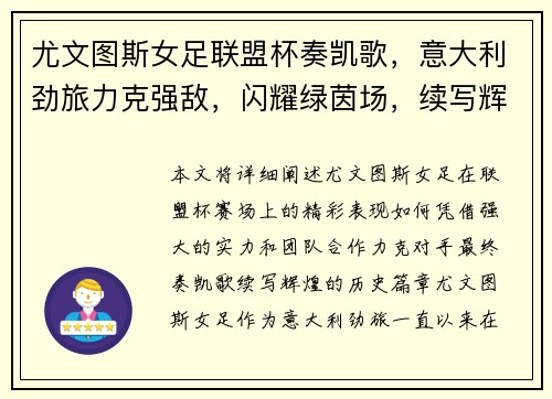 本文将详细阐述尤文图斯女足在联盟杯赛场上的精彩表现,如何凭借强大的实力和团队合作力克对手,最终奏凯歌,续写辉煌的历史篇章。尤文图斯女足作为意大利劲旅,一直以来在国际赛场上展现了不容小觑的实力,此次征战联盟杯,球队不仅面对了强敌的挑战,还通过出色的技战术表现证明了自己的综合竞争力。本文将从四个方面进行详细分析:首先是尤文图斯女足的比赛策略与战术安排;其次是球队在比赛中展现出的个人与集体的技艺水平;接下来,我们将讨论她们如何通过顽强拼搏力克强敌,展现冠军风范;最后,我们将探讨尤文图斯女足如何利用这次胜利,为未来发展奠定更为坚实的基础,续写辉煌的新篇章。